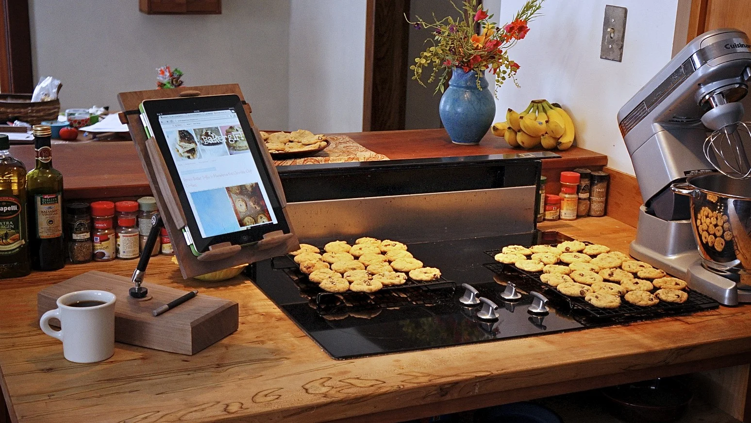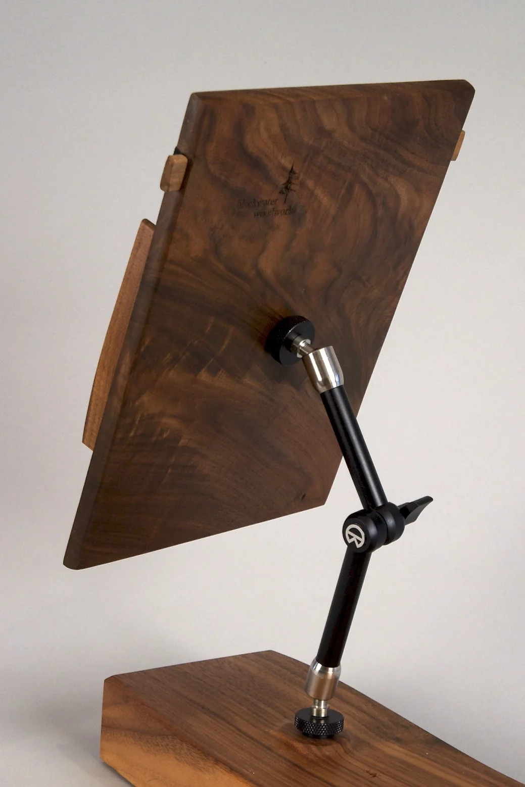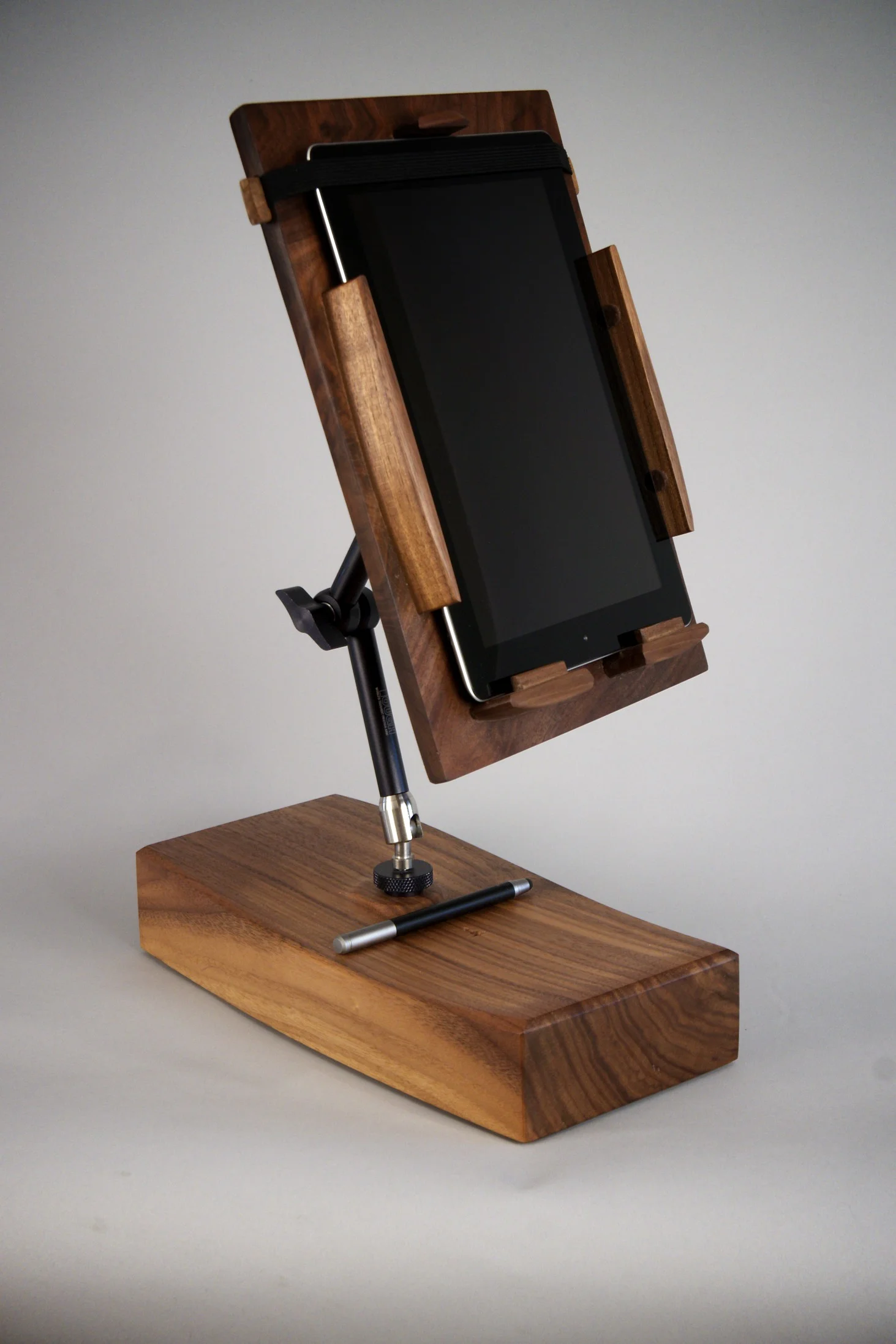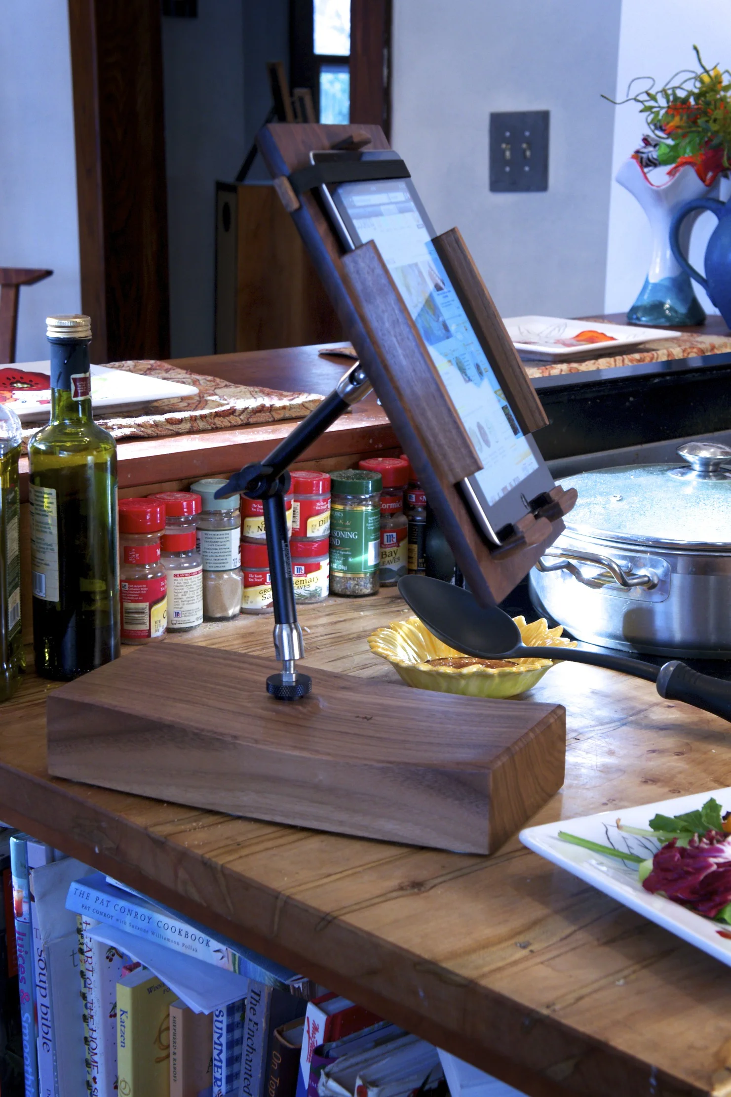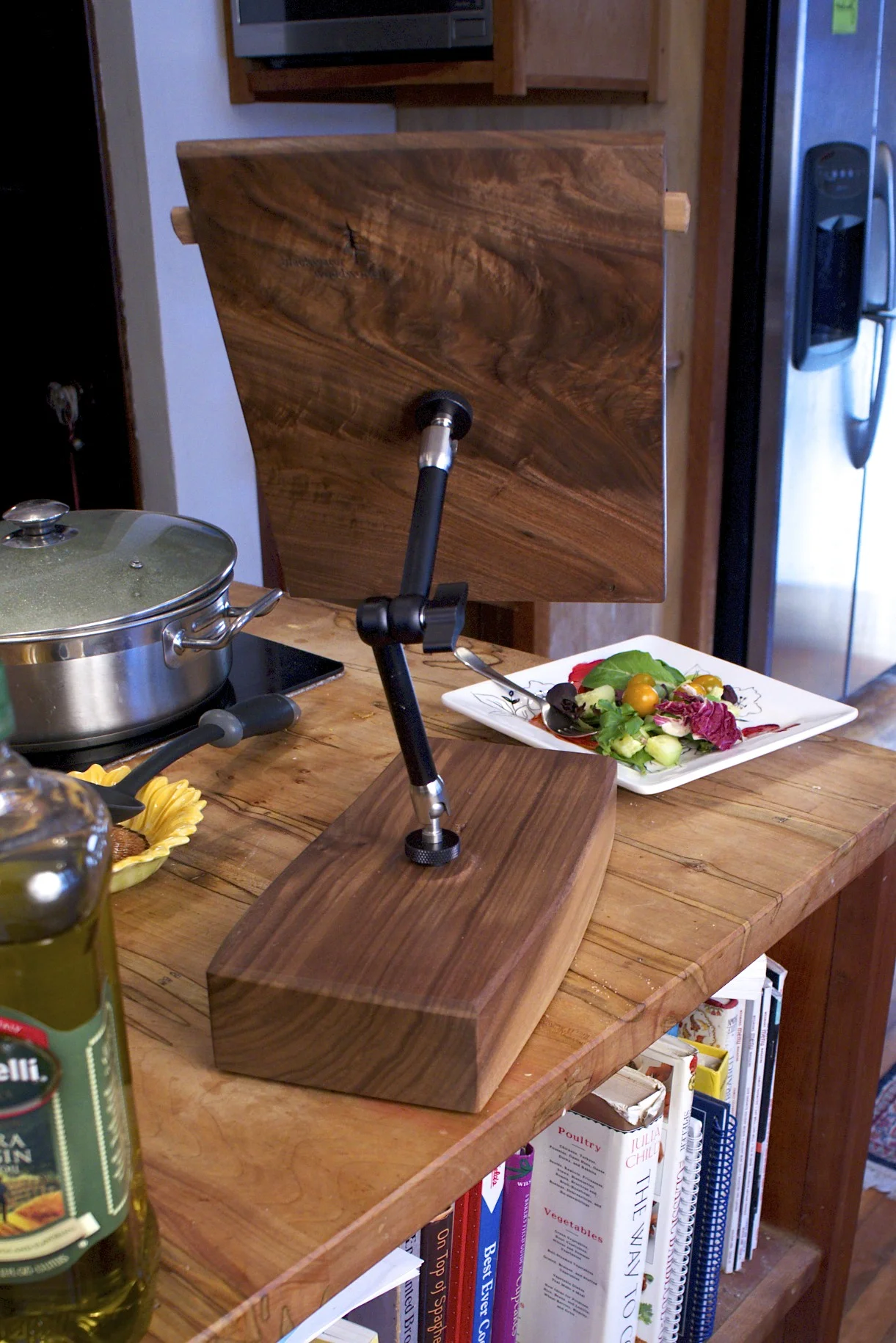 Custom designed and built in black walnut and cherry or oak. Designed to fit your new Ipad or Tablet. Will bend and tilt, in landscape or portrait mode. Useful while cooking to follow a recipe. Very nice for hands free reading at the breakfast table. Put on your coffee table to watch a movie. Finalist for the 2014 Niche Magazine Design Award.